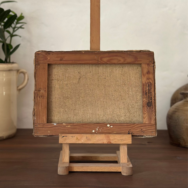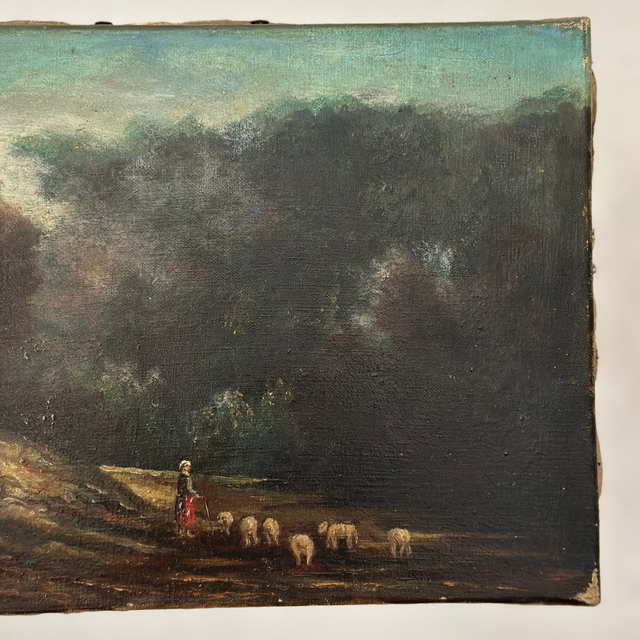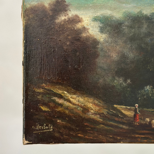 Très belle petite huile sur toile représentant une bergère et son troupeau dans un décor clair obscur de sous-bois par Herbold, XXe. La toile est joliment patinée et en bel état de conservation.