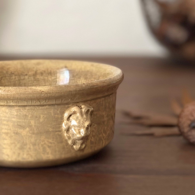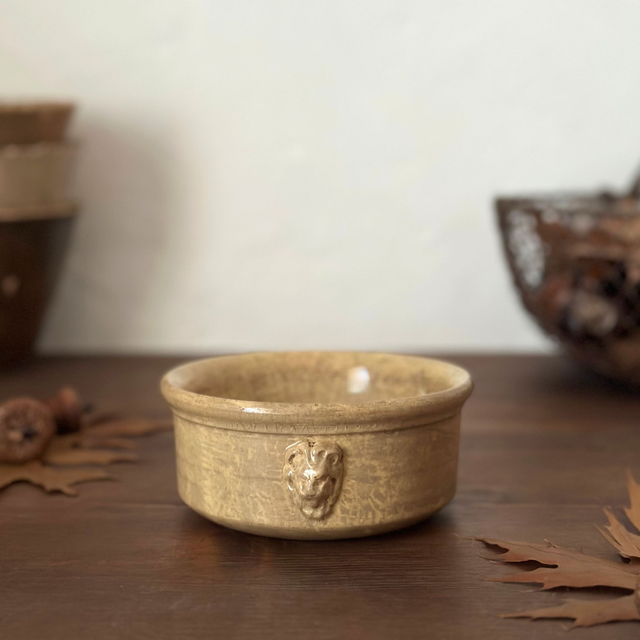 Petit ramequin tête de lion joliment patiné de la manufacture de Sarreguemines, Terre à feu.