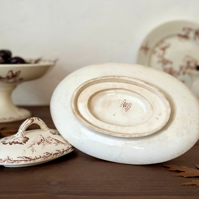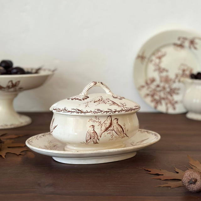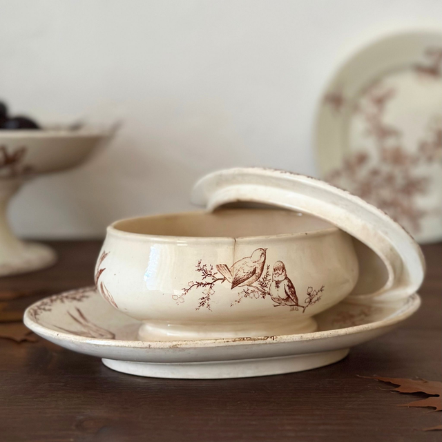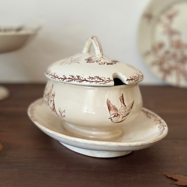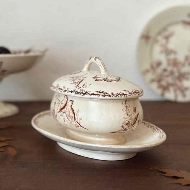 Superbe saucière avec couvercle modèle Sylva sépia de la manufacture de Creil et Montereau, Terre de fer. Nous aimons le délicat décor végétal qui accueil ces jolis oiseaux. En très bel état général, elle présente une fêle et un cheveu.