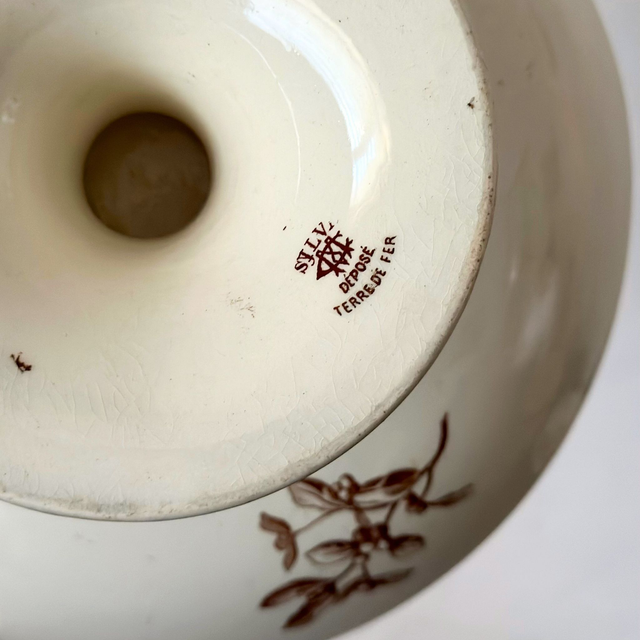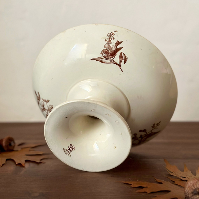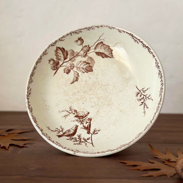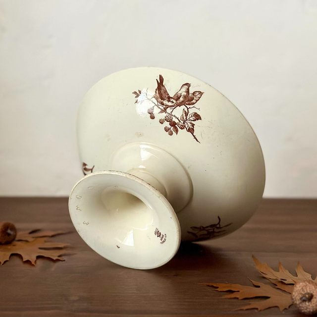 Élégant compotier modèle Sylva sépia, au charmant décor d'oiseaux et de végétaux, de la manufacture de Creil et Montereau, Terre de fer.