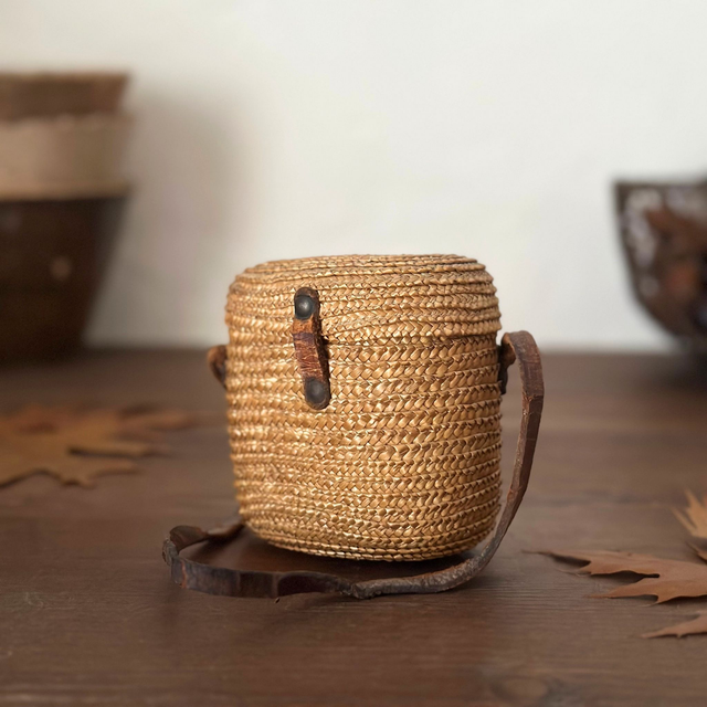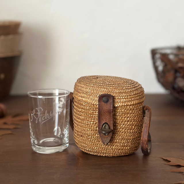 Délicat verre de curiste gravé Vichy et son étui en paille tressée et cuir. Ce dernier est un peu fatigué mais le reste est en très bel état de conservation !