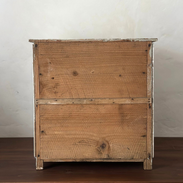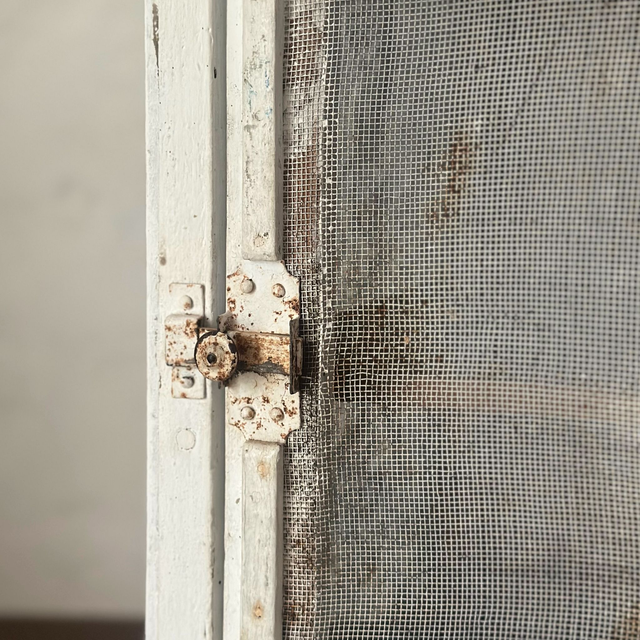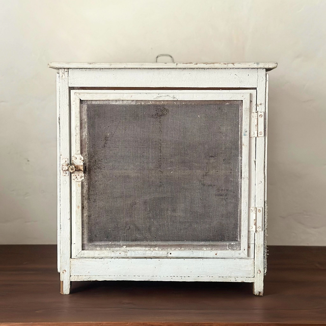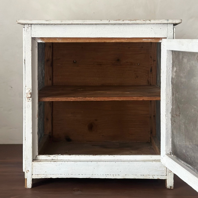 Beau garde-manger à poser avec une étagère, jolie patine sur le bois peint en blanc. Il présente une petite poignée supérieure pour le porter, le fond est plein et la fermeture fonctionne correctement. A noter la présence d'un double grillage pour pallier aux trous présent dans le plus ancien.